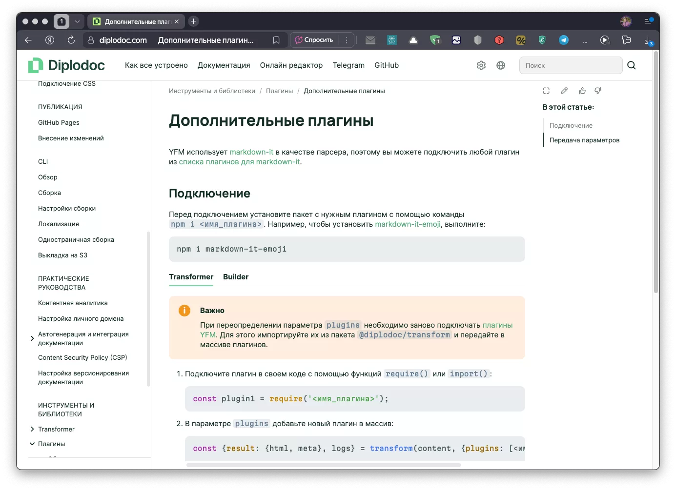 - Diplodoc: Работает на Node.js и React, выглядит неплохо, использует все плагины от markdown-it и немного своих. Можно развернуть как в облаке, так и на собственном сервере. Из минусов их yfm-расширение markdown показалось мне слишком похожим на HTML, а не markdown, но это дело вкуса.