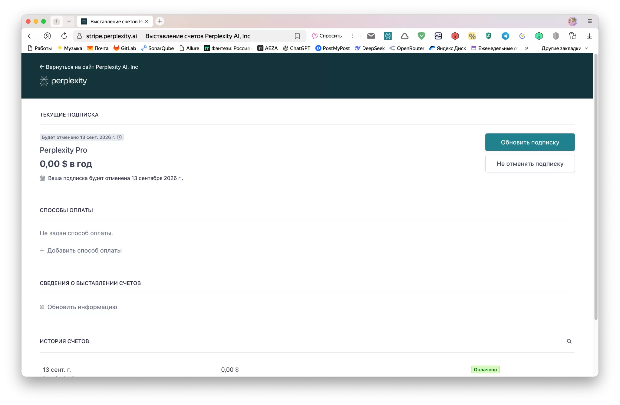 Но на сайтах типа ggsel.net то же самое предлагают купить за 500 рублей в год. Как так? Не понятно… Я так и не понял, но в личном кабинете указана цена подписки как $0 и все регистрируется на мою почту официально и на год. Возможно, какие-то акции самого перплексити, но это — большой вопрос конечно. В чем подвох я так и не понял.