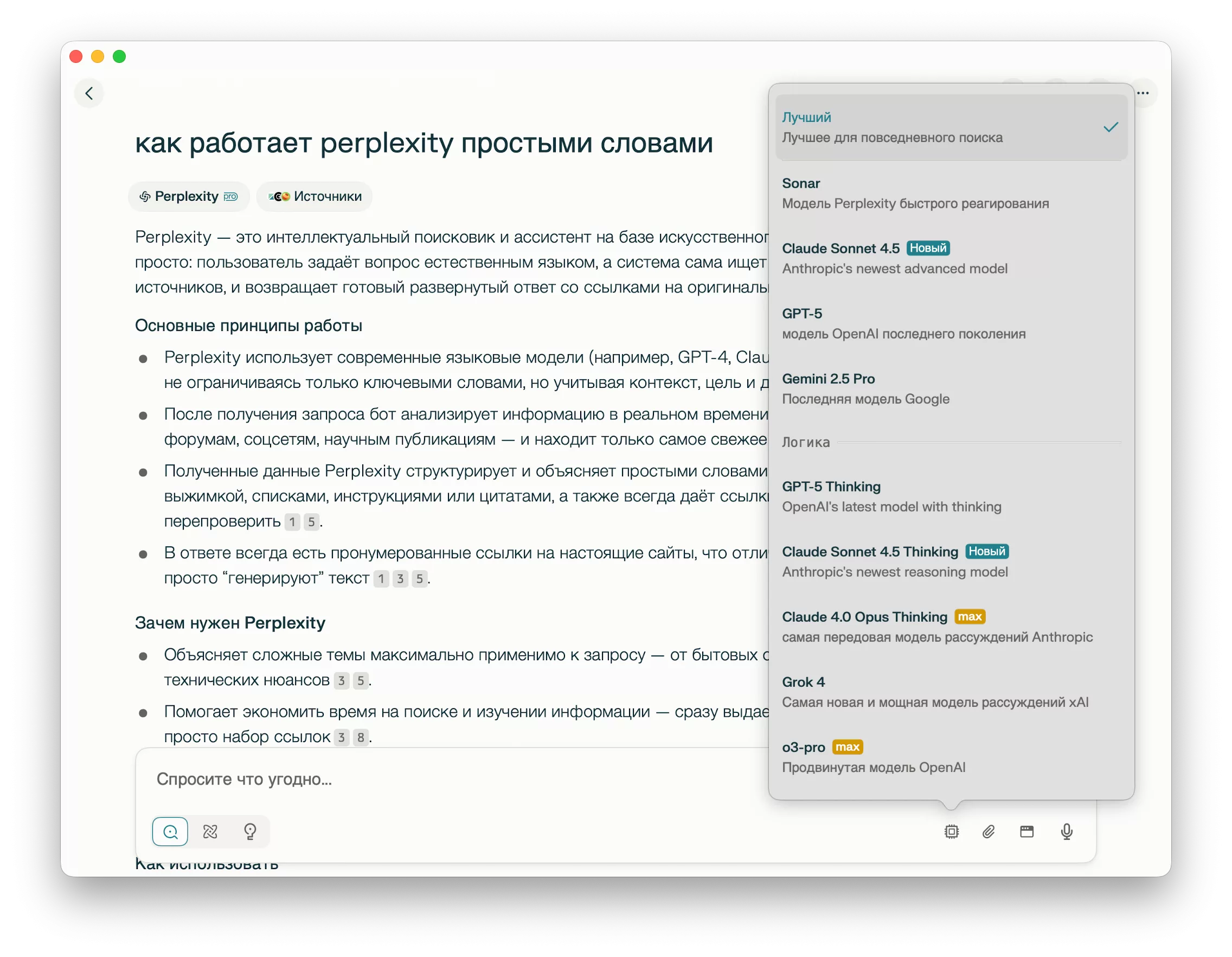 - Perplexity быстро ищет в интернете, выбирая подходящие сайты.